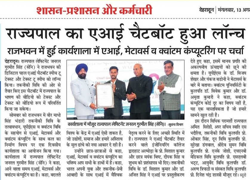 Congratulations to Dr. Vishal Kumar, AP CSE, and team for launching Uttarakhand Governor’s AI Chat Bot. Posted by BTKIT Admin Categories Events Date August 13, 2024 Share: BTKIT Admin Previous post Congratulation to Dr. Vishal Kumar, AP CSE & Team for Launching Uttarakhand Governor's AI Chat Bot August 13, 2024 Next post BTKIT NSS Unit Celebrating Har Ghar Tiranga Abhiyan August 14, 2024 You may also like Dr. R.K. Bharti, Teacher of the Year (DISTF-2025) 18 November, 2025 State Level Panel Discussion(Silver Jubilee Celebration of the formation of Uttarakhand) 11 November, 2025 Workshop on Intellectual Property Rights on 6 November 2025 6 November, 2025